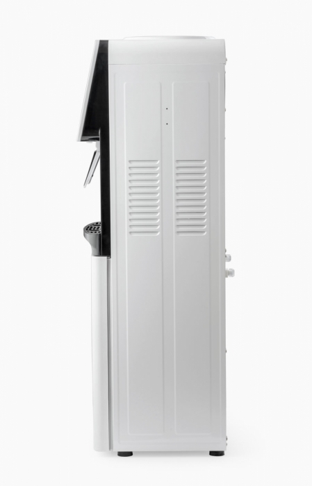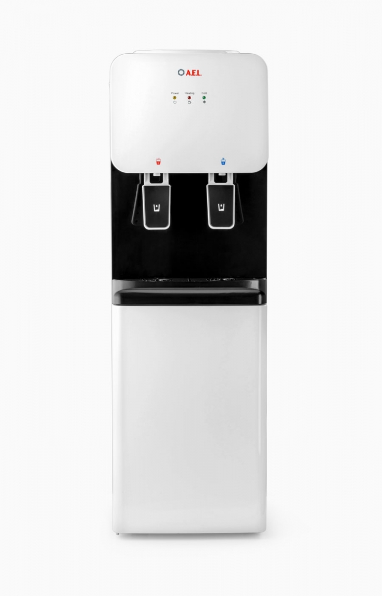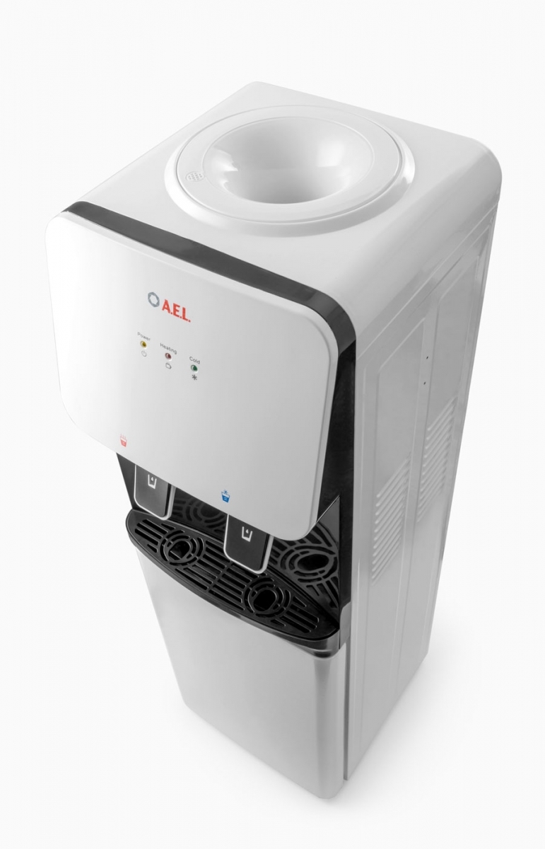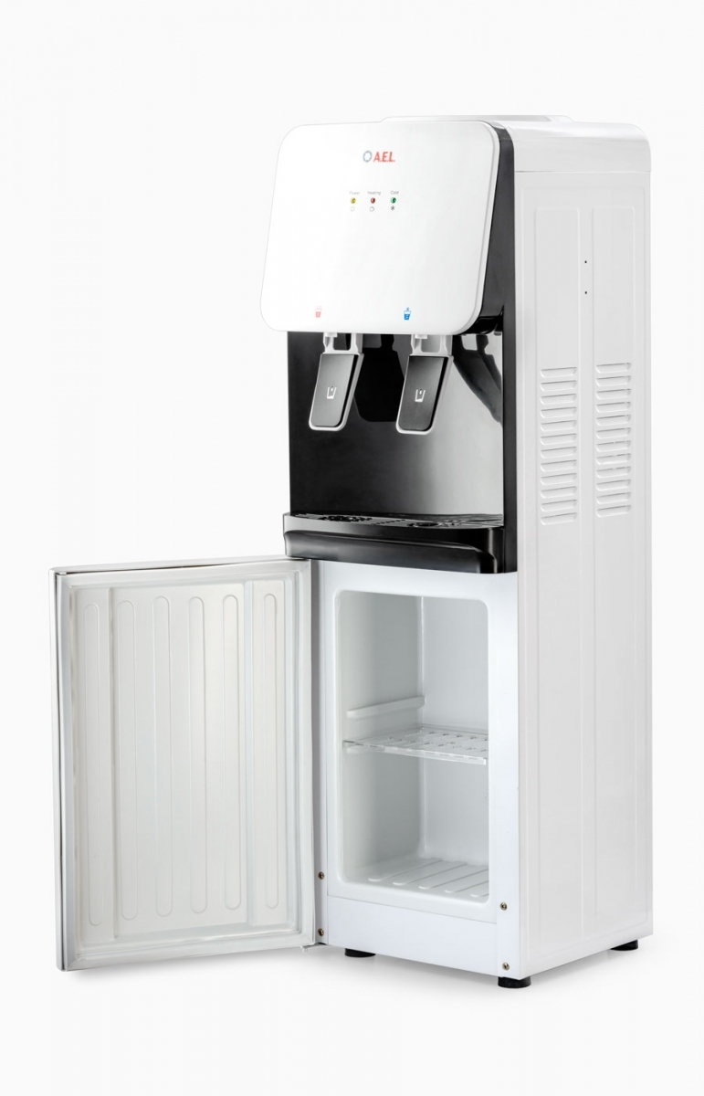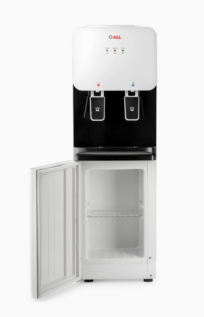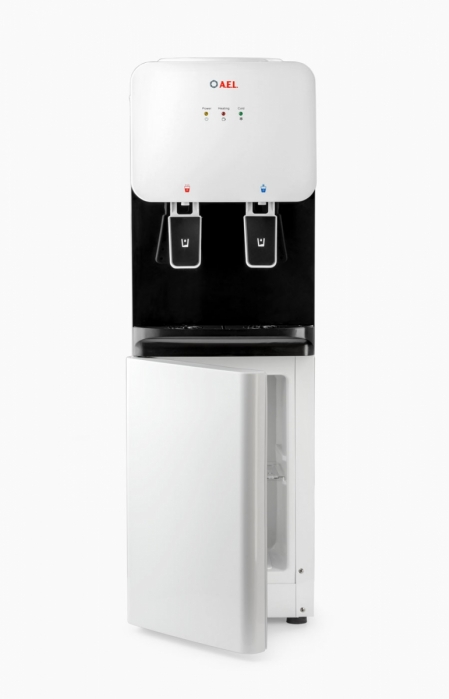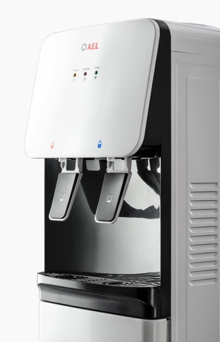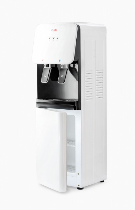 Напольный кулер с электронным охлаждением, нагревом и шкафчиком для продуктов. Гладкая лицевая панель, удобные краны "нажим чашкой" и малые габариты этого аппарата эргономично впишутся в Ваш офис.