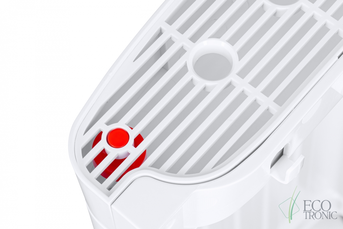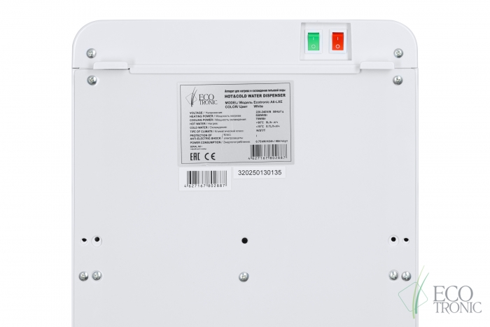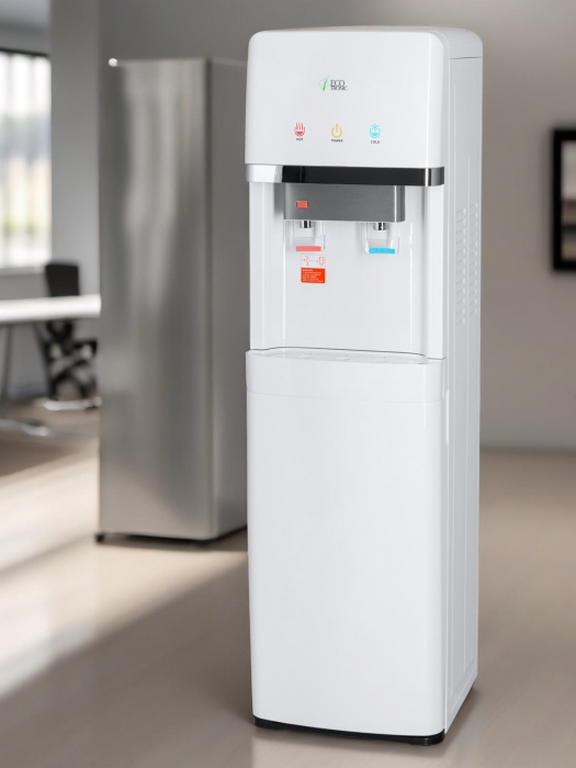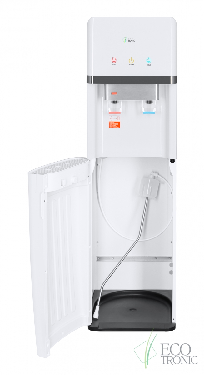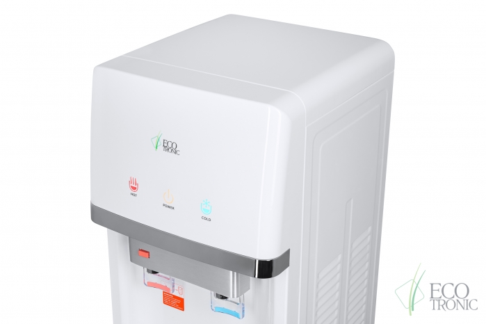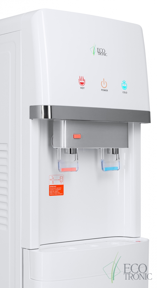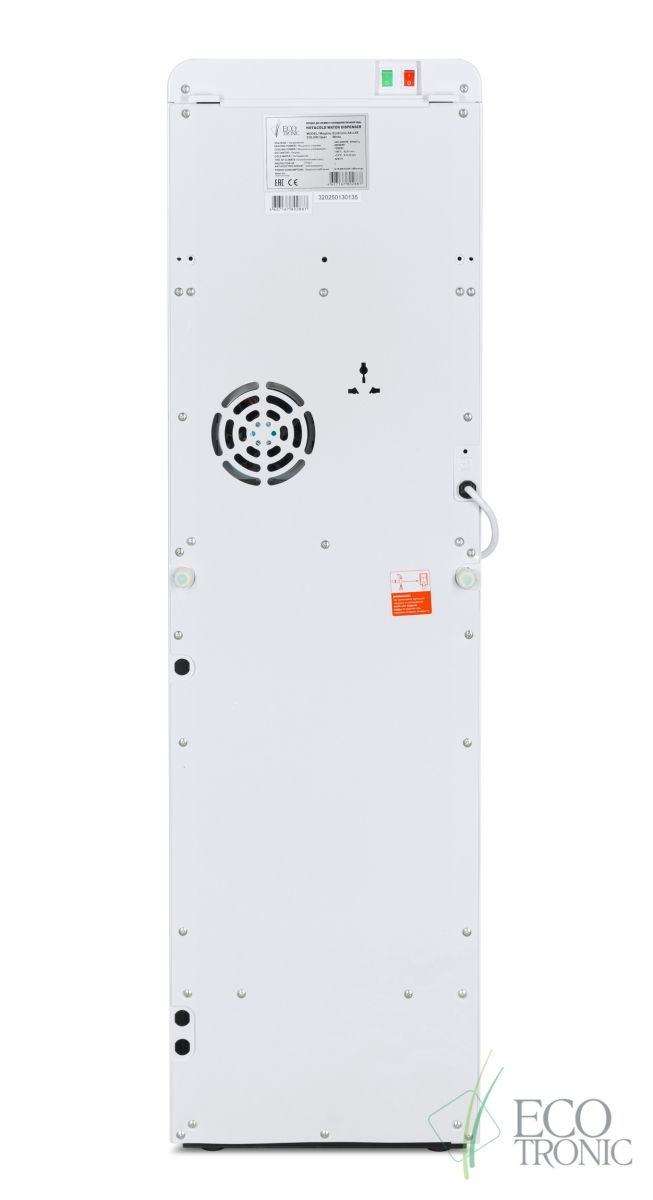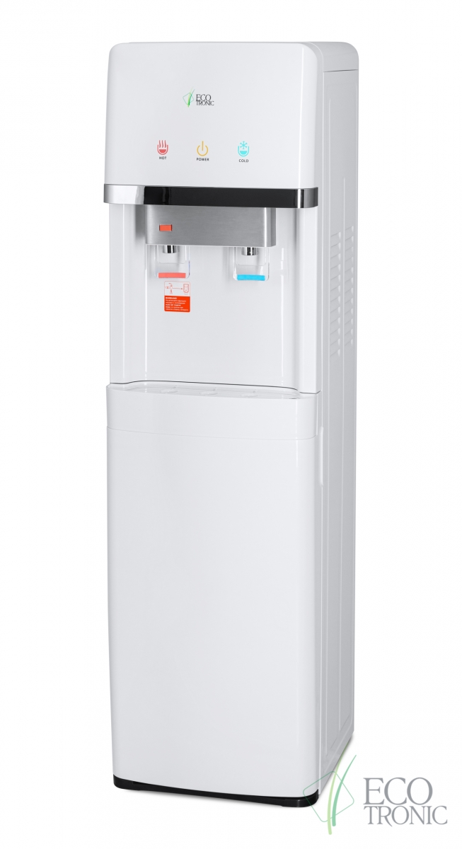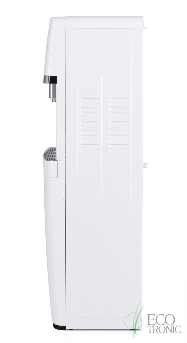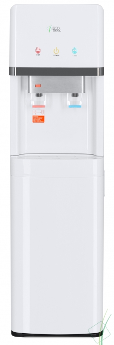 Напольный кулер с нижней загрузкой бутыли и электронным охлаждением. Корпус белого цвета с серебристым декором. Лоток водоприема с поплавком перелива. Индикация режимов нагрева и охлаждения воды и работы аппарата. Краны «нажим кружкой», защита от детей на кране горячей воды.