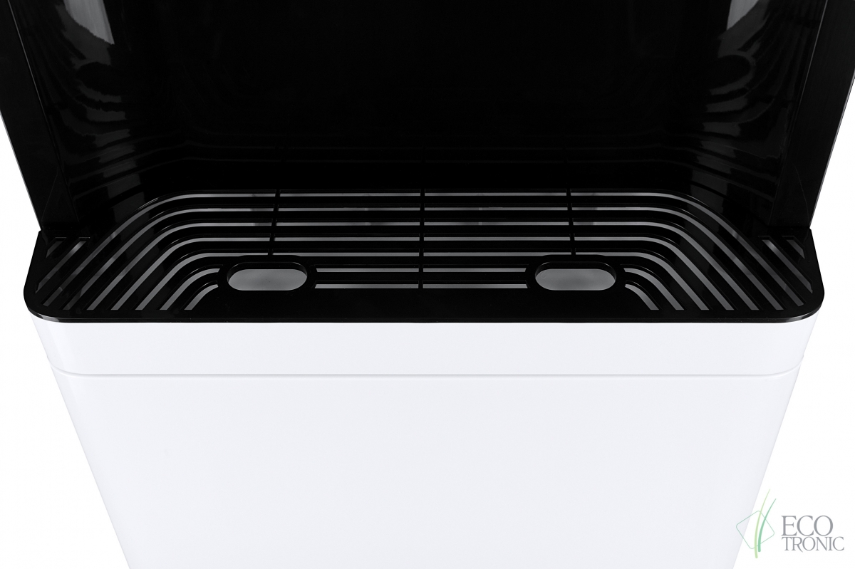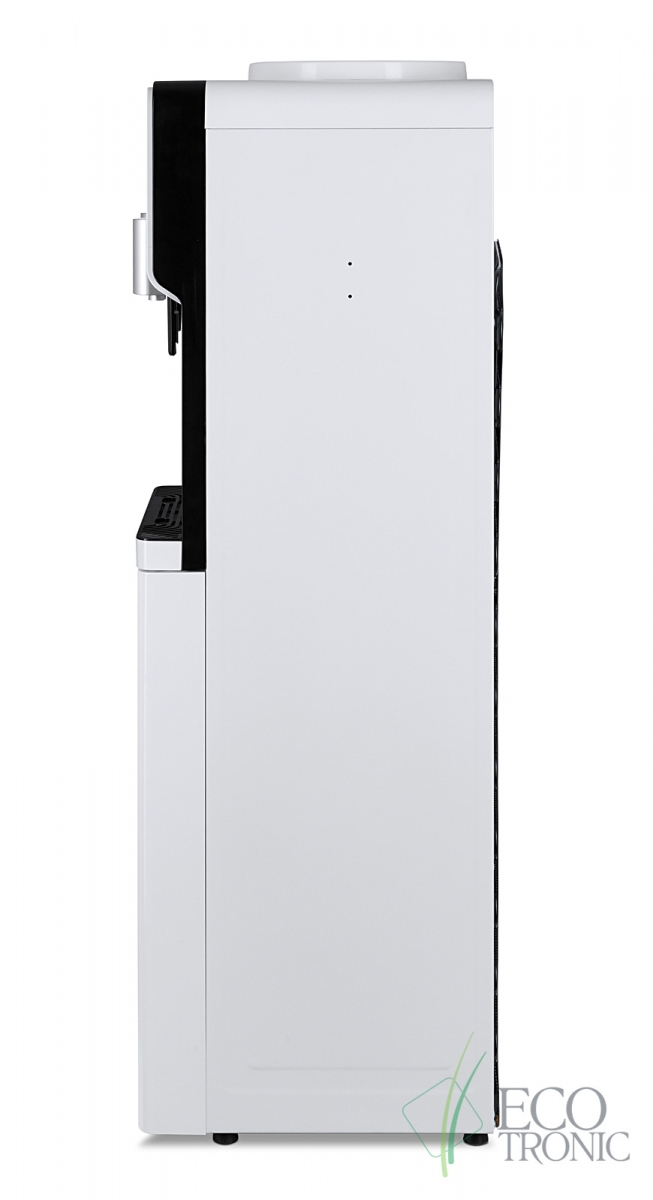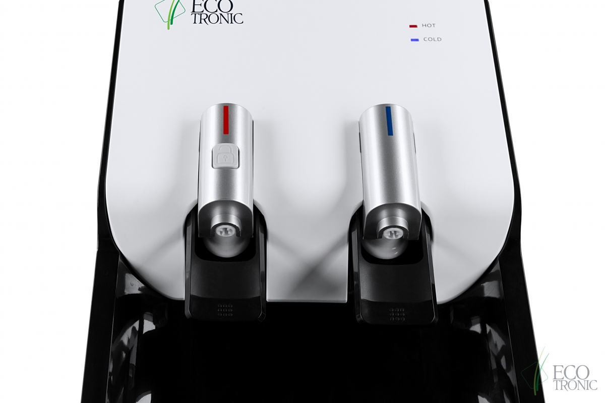 Корпус белого цвета, на передней панели элегантная черная вставка. Защита от детей на кране гв. Индикация режимов нагрева, охлаждения и готовности воды. Краны «нажим кружкой».