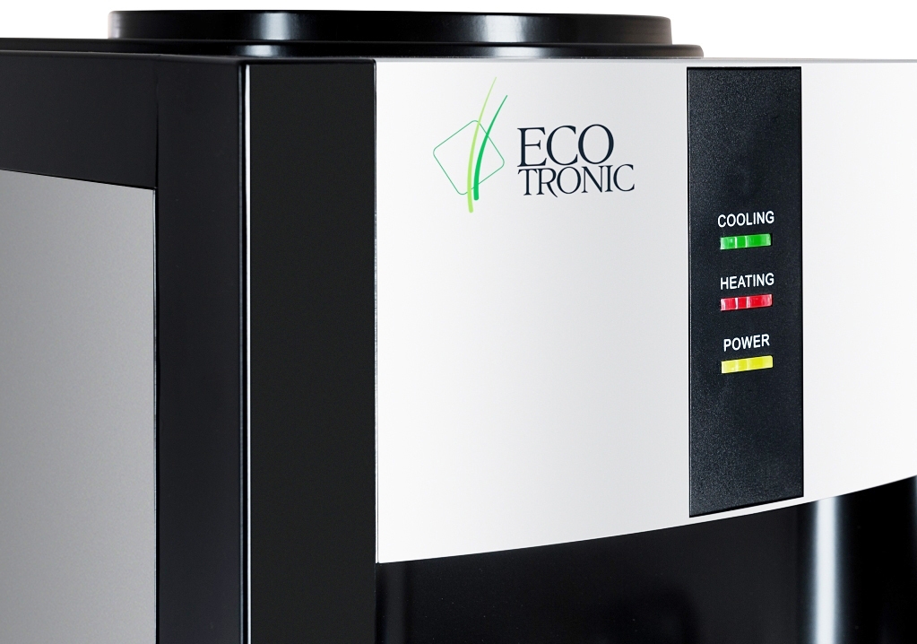 Настольный кулер с электронным охлаждением, цвет черный с серебристой вставкой. Тип кранов подачи воды - "Нажим кружкой". Одинарный блок охлаждения.