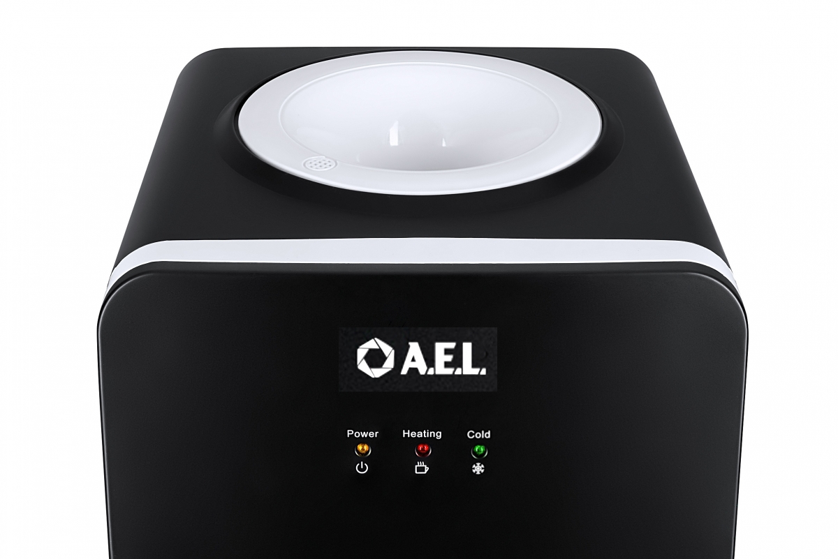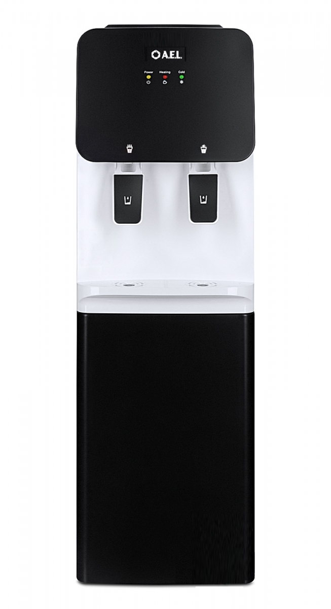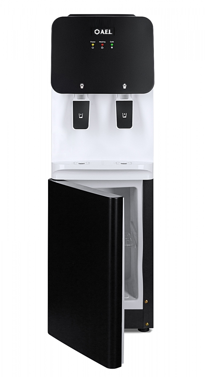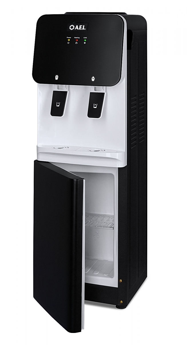 Напольный кулер с электронным охлаждением, нагревом и шкафчиком для продуктов. Гладкая лицевая панель, удобные краны "нажим чашкой" и малые габариты этого аппарата эргономично впишутся в Ваш офис.