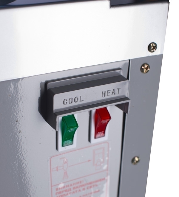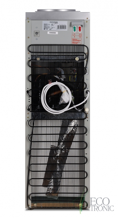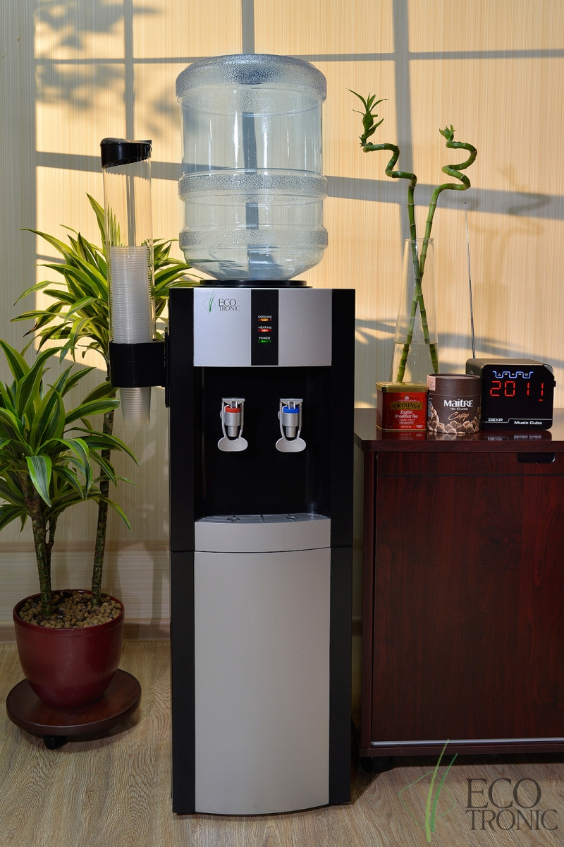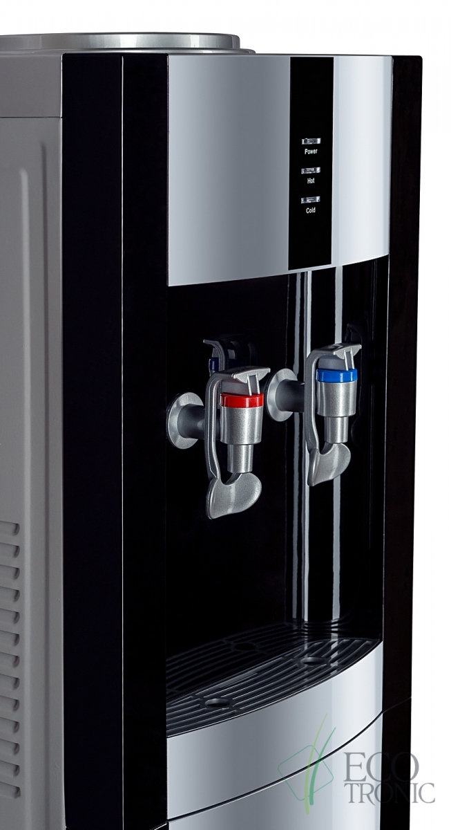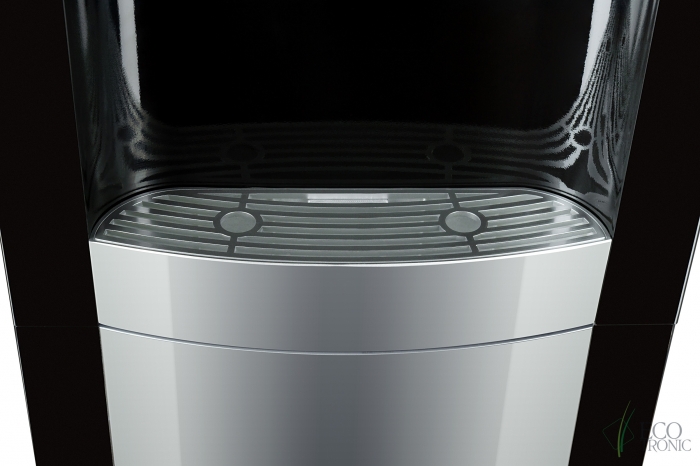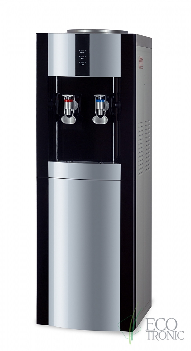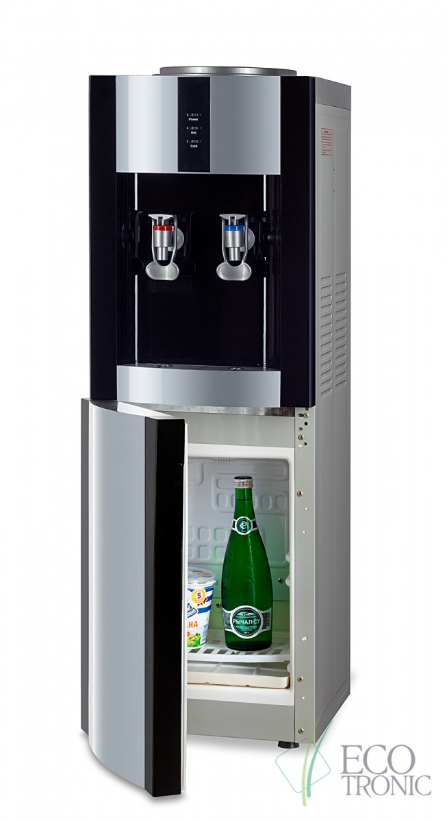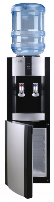 Напольный кулер черного цвета с серебряной вставкой и с компрессорным охлаждением. С холодильником.