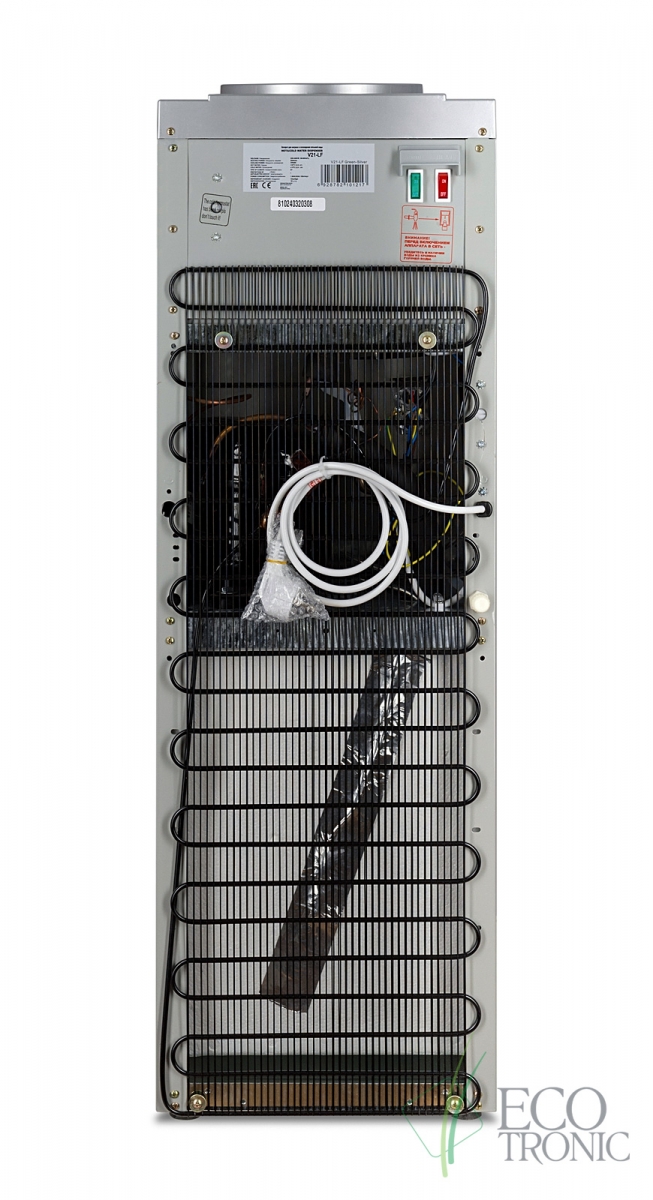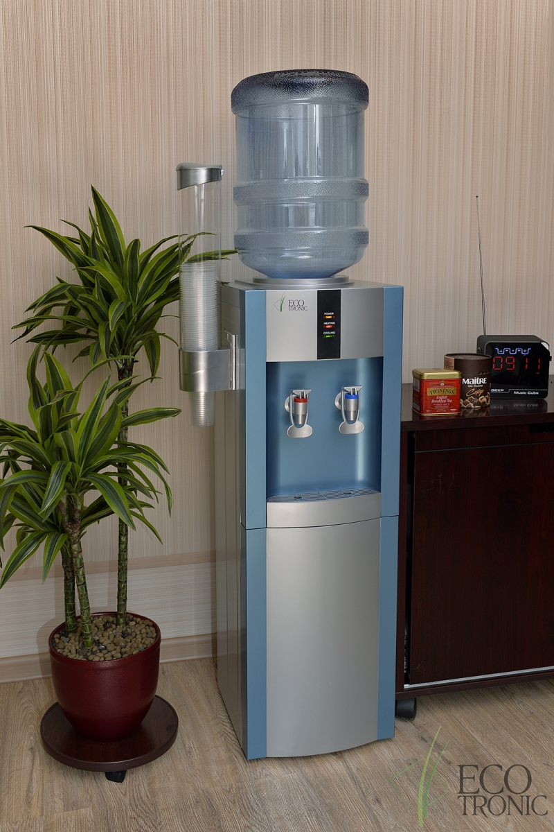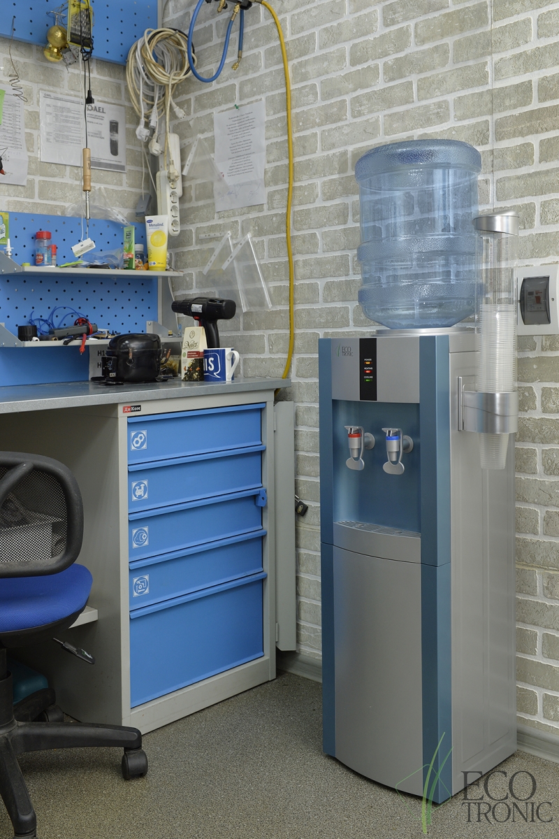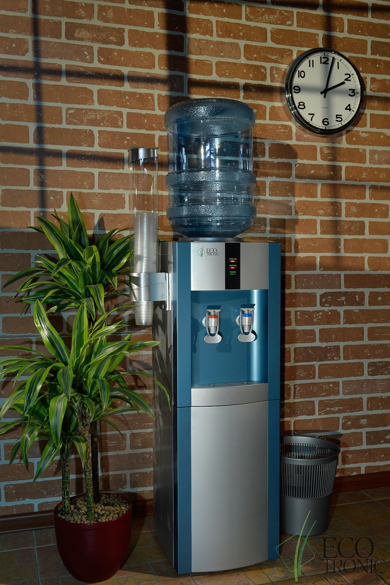 Напольный кулер с компрессорным охлаждением. С холодильником. Цвет морской волны с серебристой вставкой.