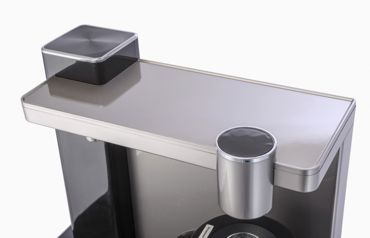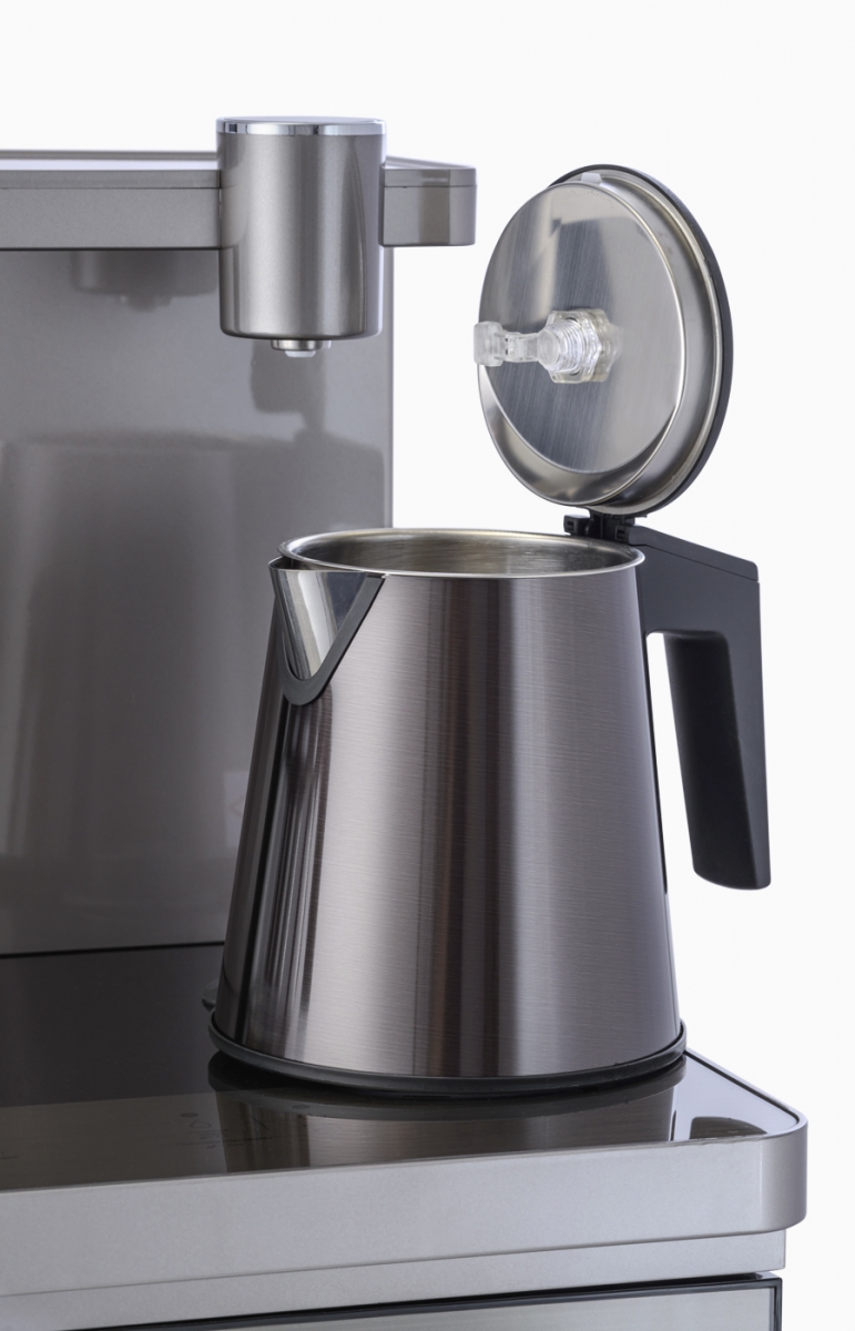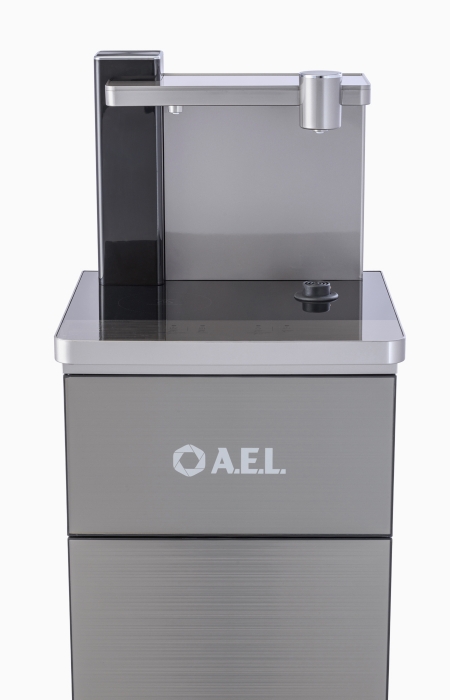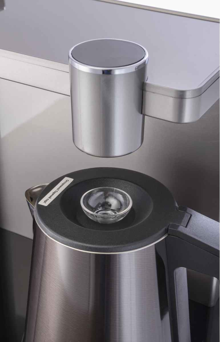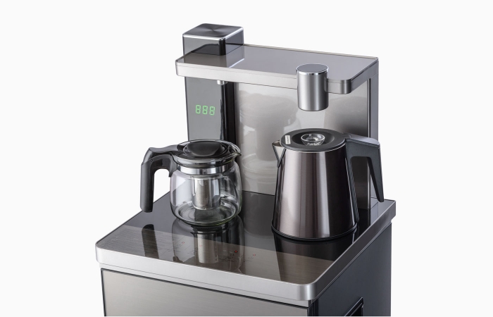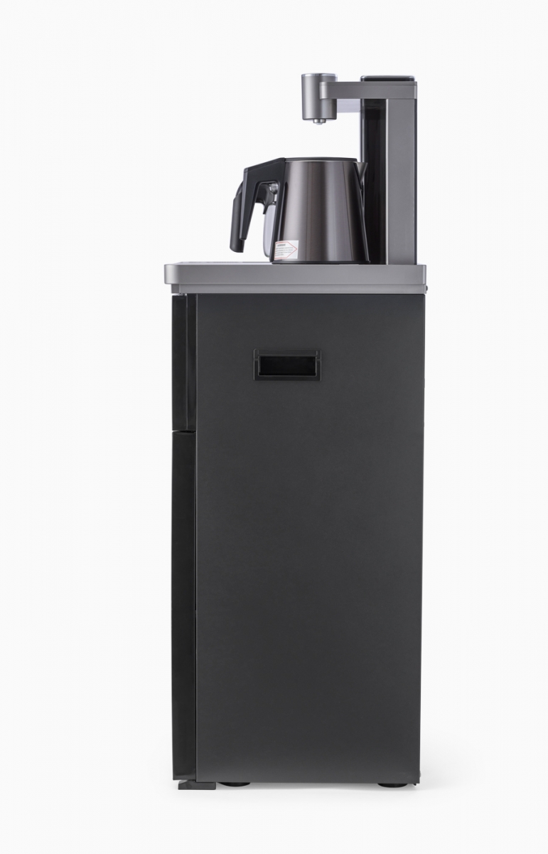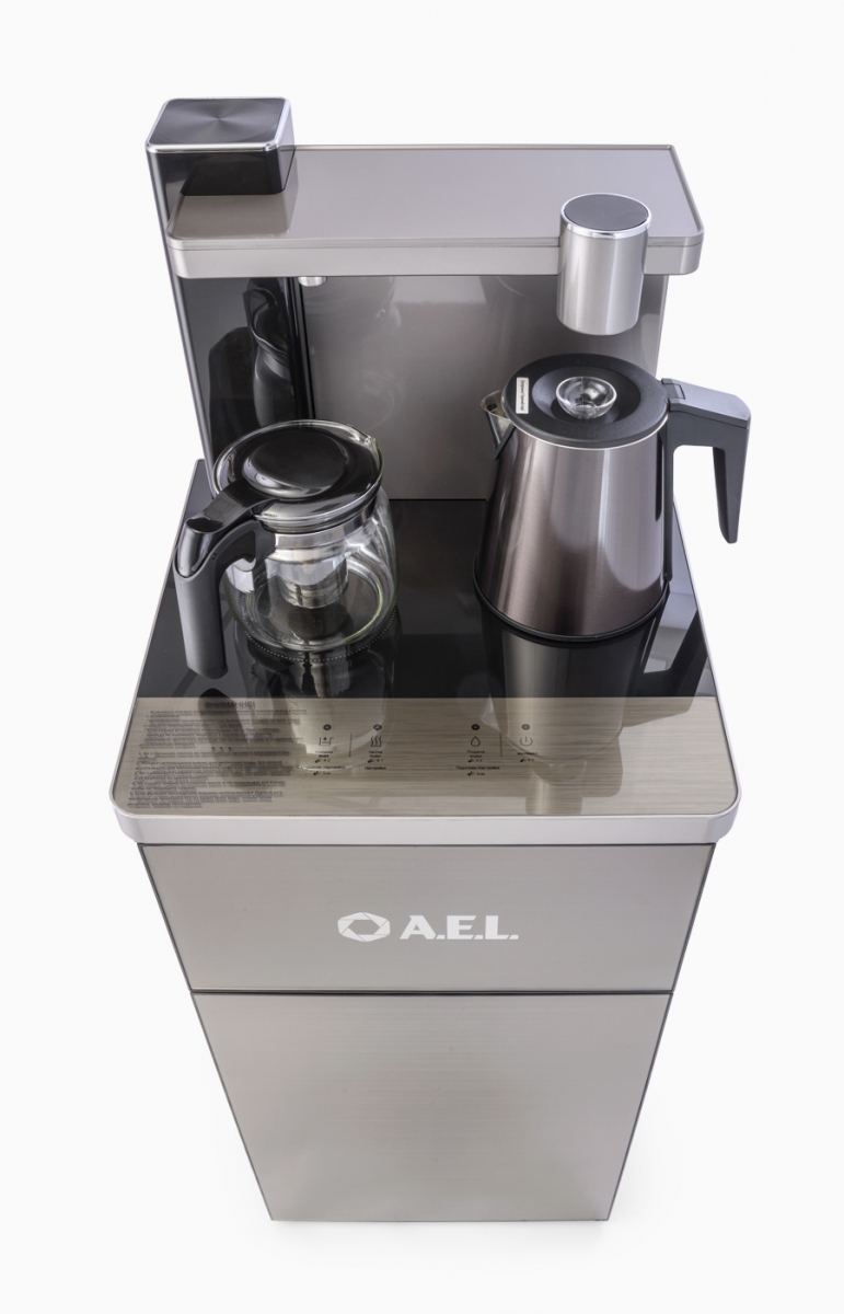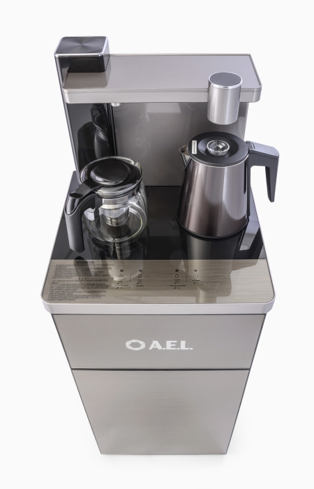 Оригинальное исполнение кулера с нижней загрузкой бутыли с электронным охлаждением. Состоит из заварочного и электрического чайников, сенсорной панели управления, полочки для чашек, шкафчика для хранения. Яркая световая индикация и информативный дисплей на панели сообщат о текущем температурном режиме и подключении к сети.