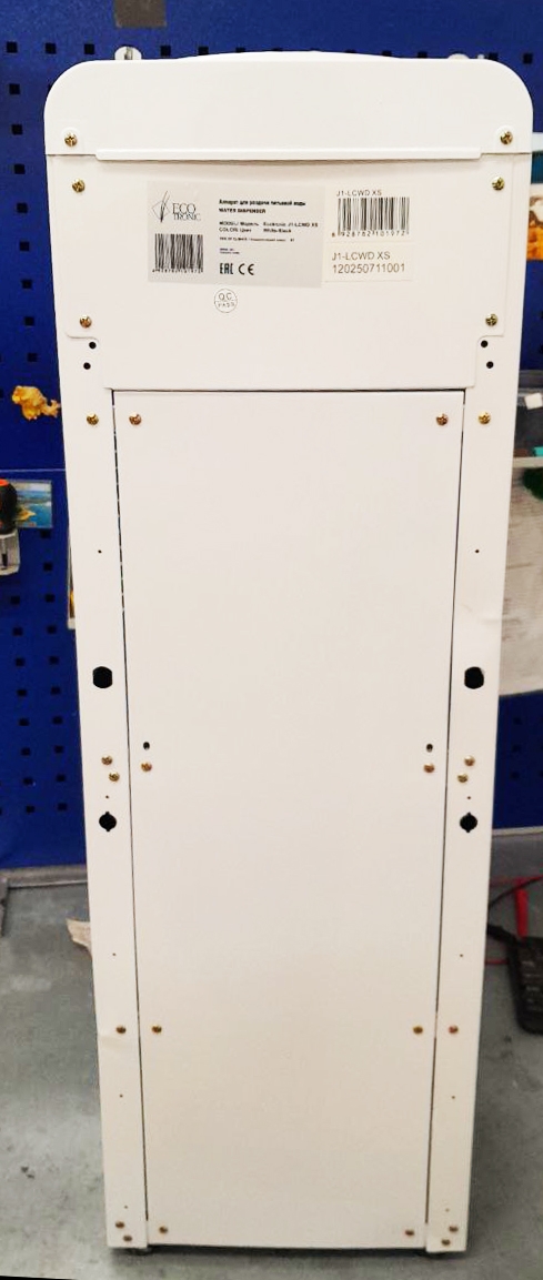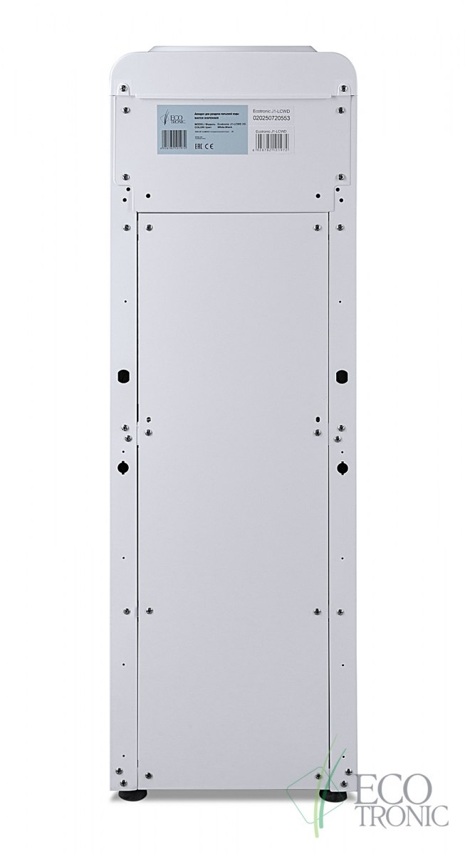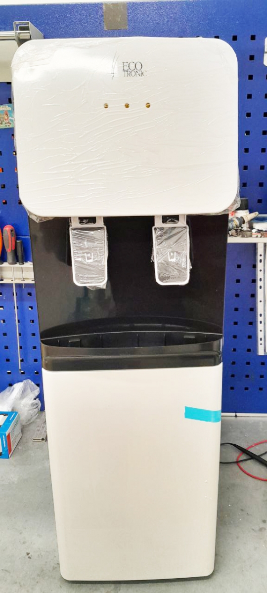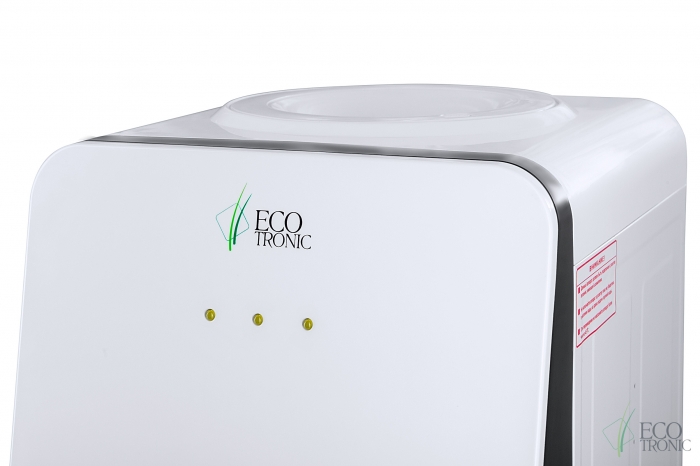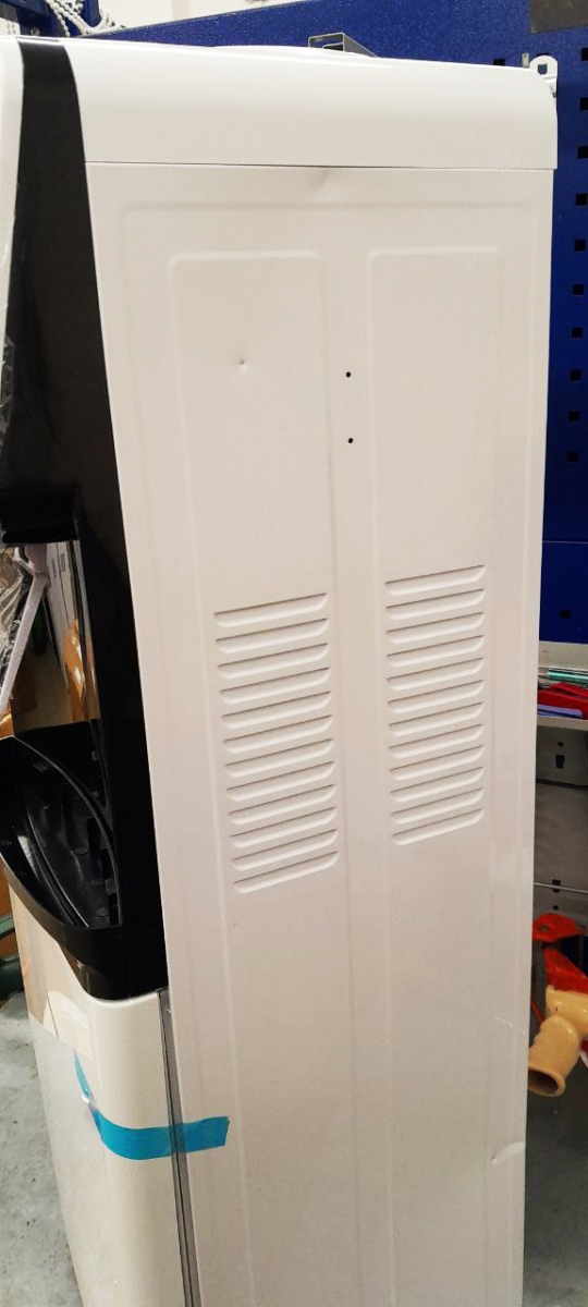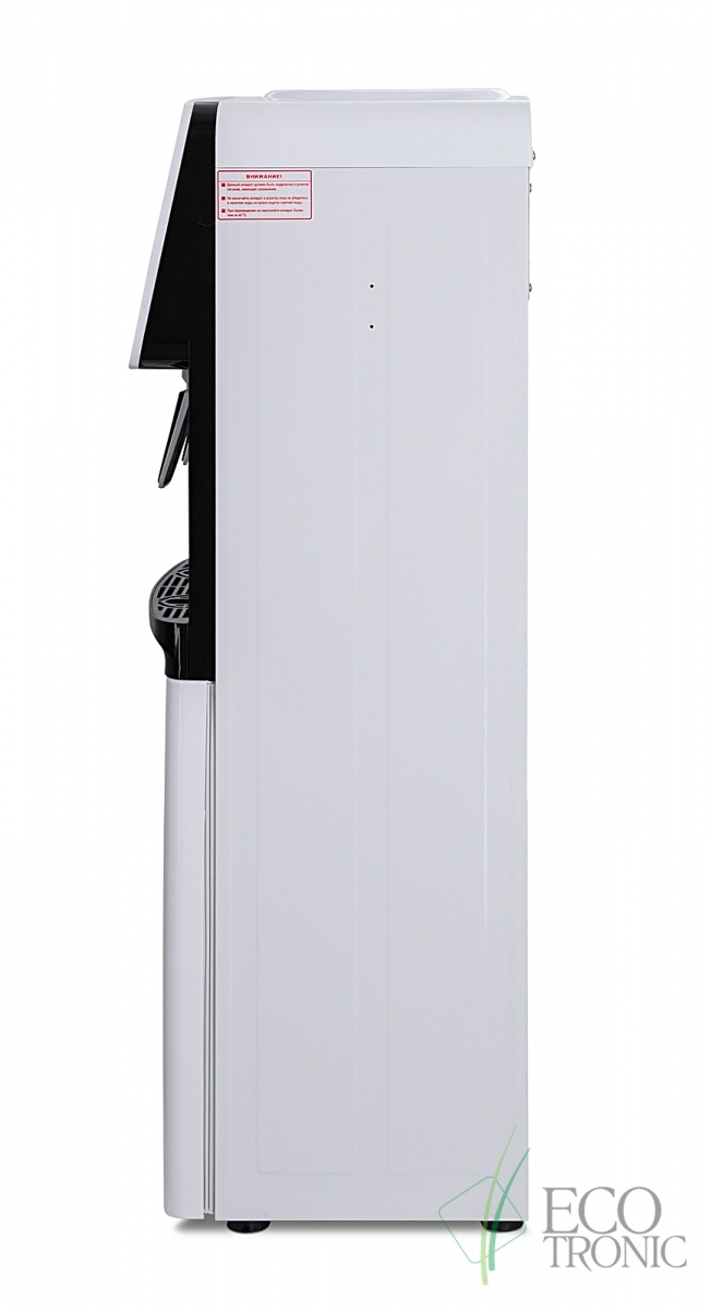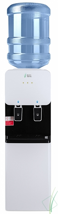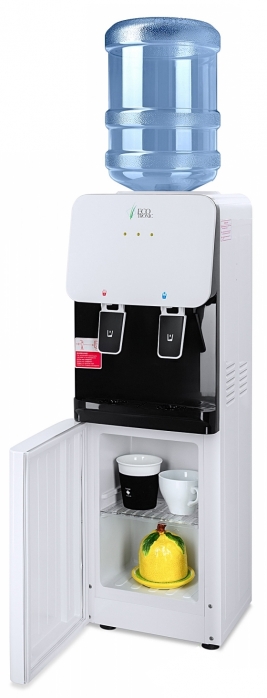 Компактный раздатчик для воды без нагрева и охлаждения. С небольшим шкафчиком в нижней части. Корпус белого цвета с черной вставкой в области кранов подачи воды. Без подключения к сети. Краны «нажим кружкой».
