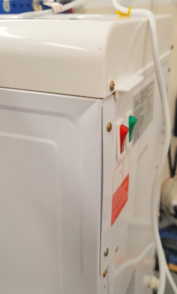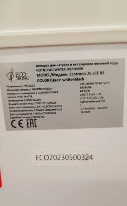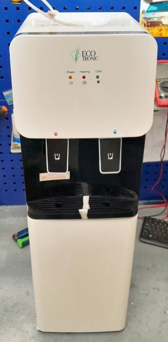 Компактный кулер для воды с функциями нагрева и охлаждения. С небольшим шкафчиком в нижней части. Электронное охлаждение. Корпус белого цвета с черной вставкой в области кранов подачи воды. Индикация режимов нагрева, охлаждения и готовности воды. Краны «нажим кружкой».
